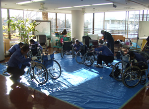 損保ジャパンでは、CSR(企業の社会責任)の一環として、社員と代理店の皆さんがボランティア活動をされています。今回、損保ジャパン西東京支店の職員14名、J-SA西東京支部会員8名、AIRジャパン西東京支部会員7名の計29名がお集まりになり、車椅子の整備・清掃をしてくださいました。